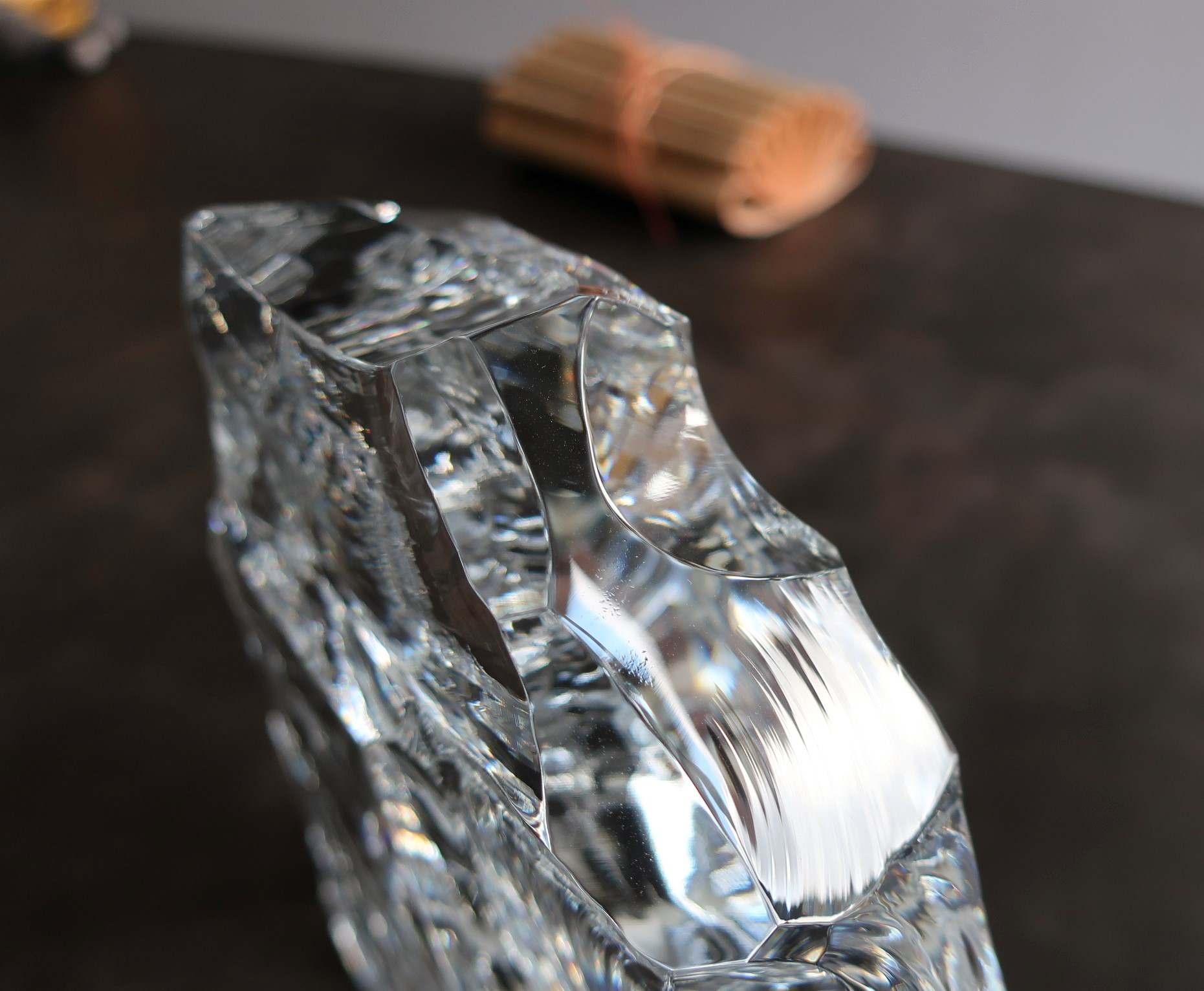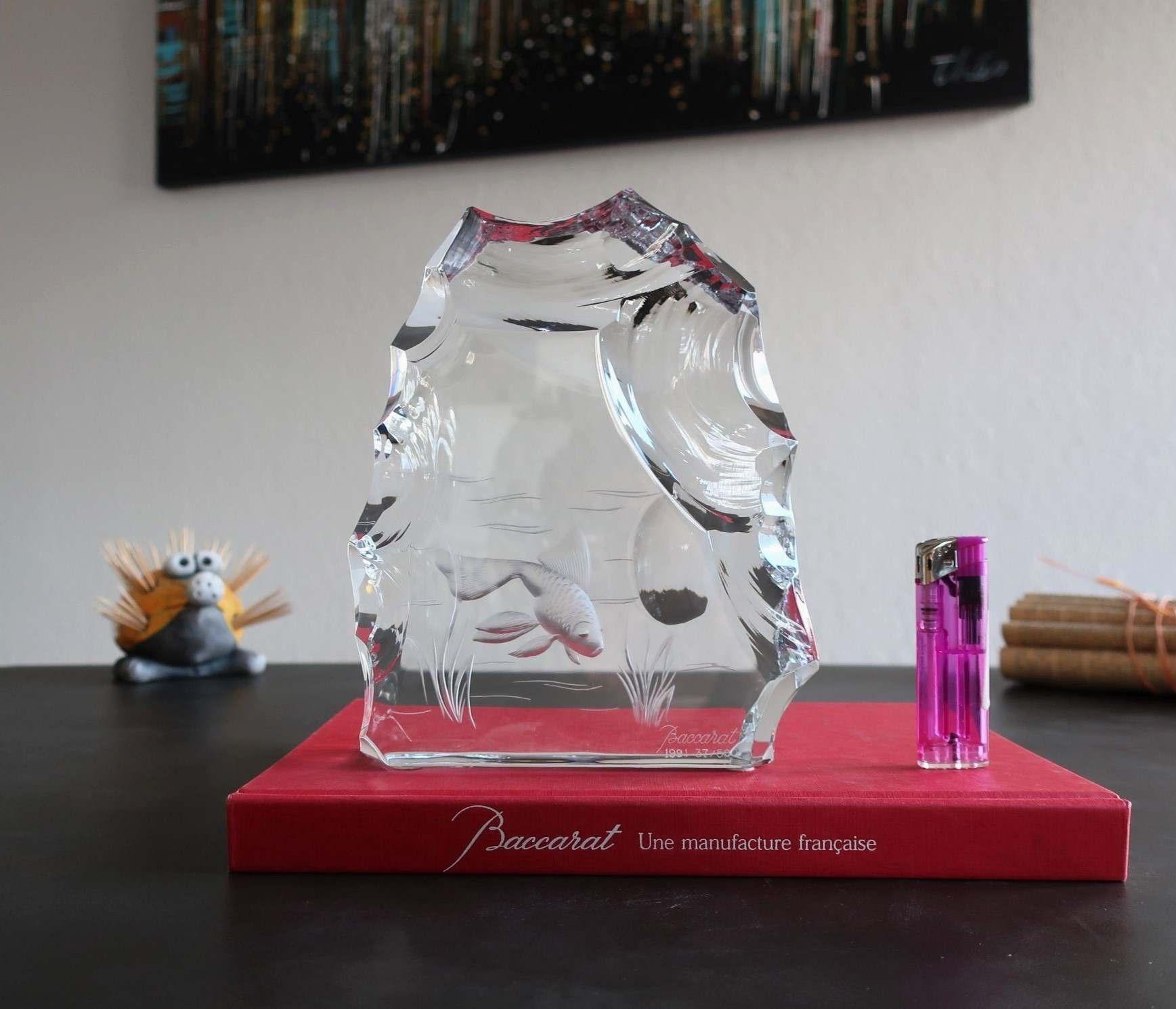 Une oeuvre en cristal Baccarat de 1991. Au premier coup d'oeil, ce bloc de cristal fait immédiatement penser au travaill d'un tailleur de pierre (éclaté au burin) tellement que la ressemblance est frappante ! Le côté naturaliste est davantage accentué avec la présence d'un décor aquatique. Grâce à la gravure à la roue, les détails sont saisissants ( herbiers, nageoires, écailles...) et ce relief, nous donne réellement l'impression d'être devant un aquarium. Une jolie sculpture à mettre en valeur avec un éclairage approprié, par exemple. Edition limitée à 50 exemplaires.