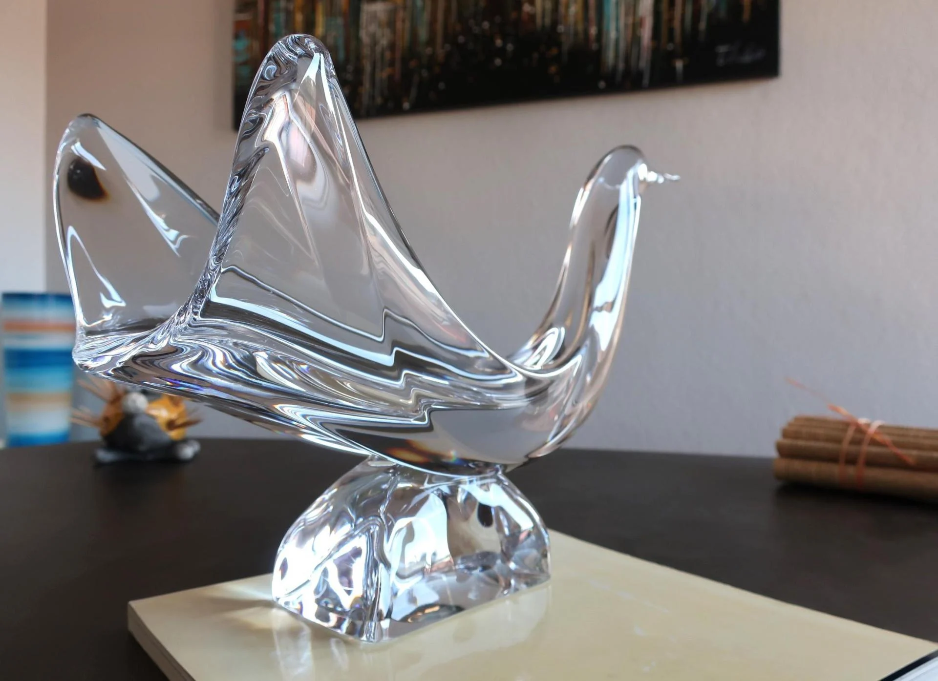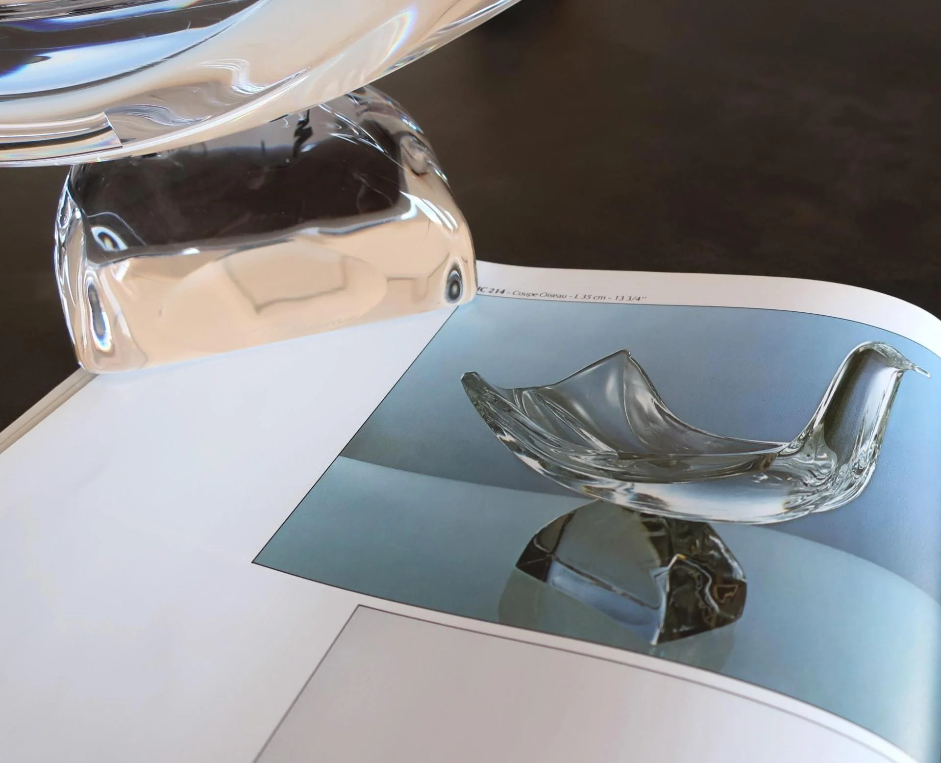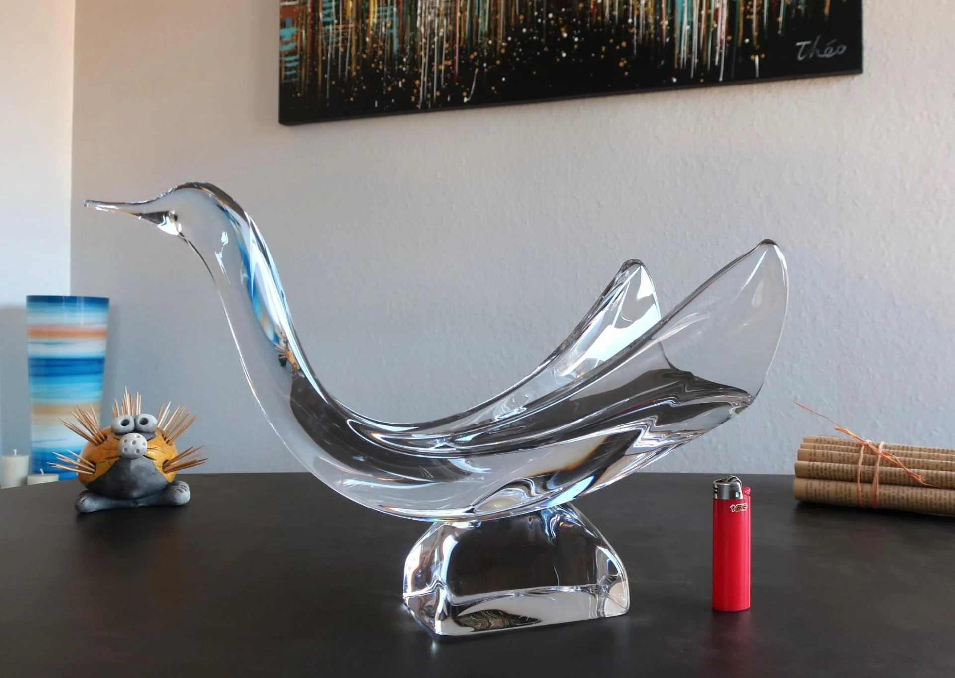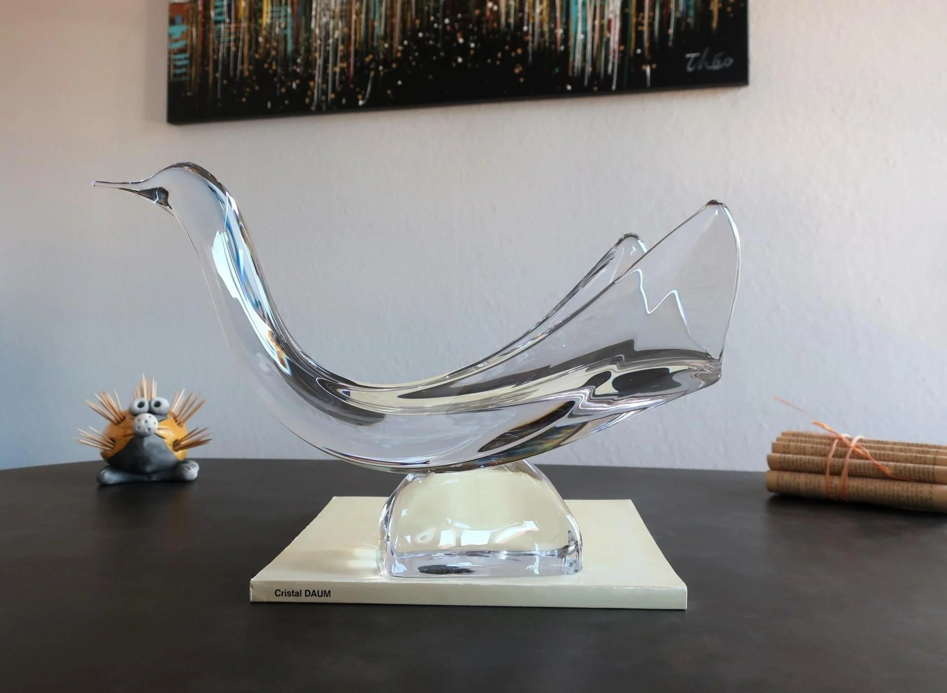 Après la seconde guerre mondiale, il faut à nouveau se réinventer. La maison Daum travaillera uniquement le cristal (avant de renouer avec la pâte de cristal) et fait le pari audacieux, de miser sur un cristal nu, fluide, promouvant la souplesse de la matière...pari réussi, le succès est au rendez-vous ! La variété des créations comme sur le côté bestiaire (les dauphins, les cigognes...) également des vases, coupes " Sirius " ou encore les services de verres tels que Kim et Sorcy, deviendront en quelques années les porte-drapeau de cet esthétisme, si caractéristique des années 50/60.