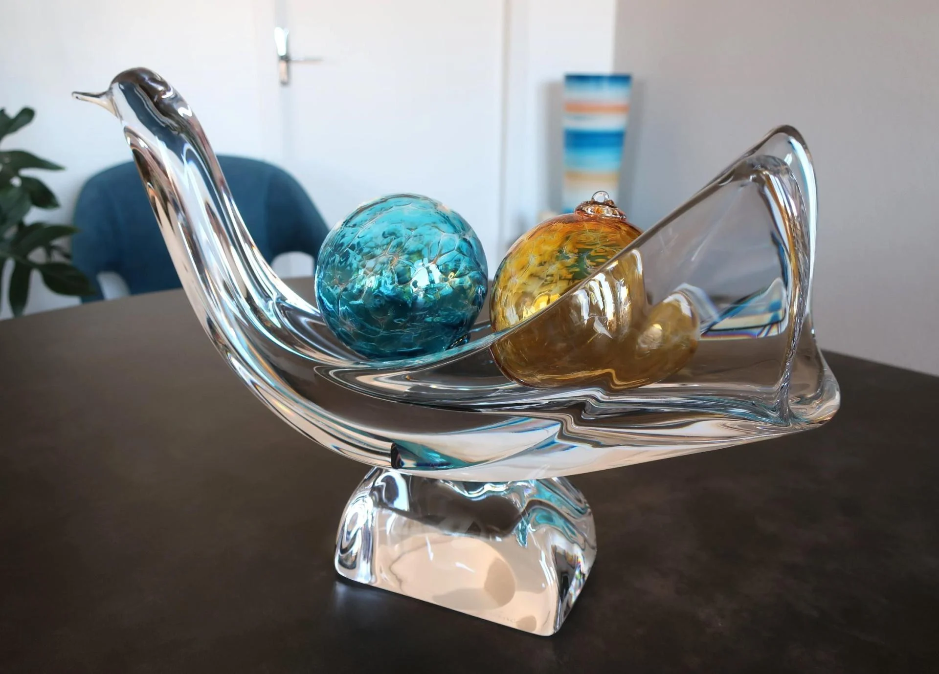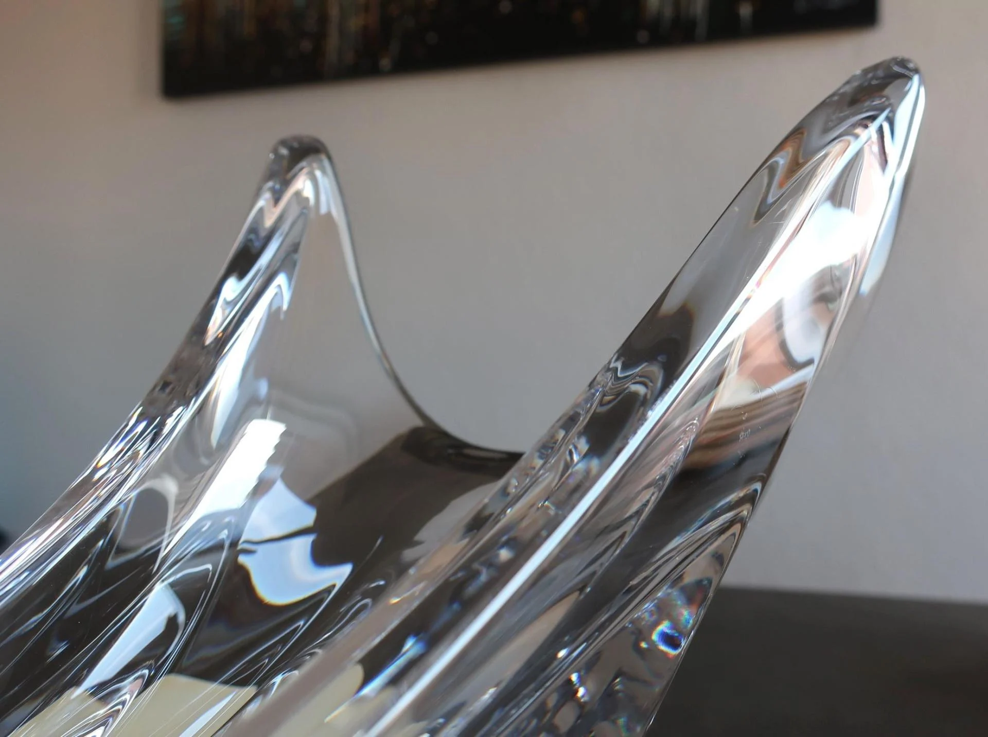 De manière générale, hauteur au plus haut 25,3cm/ Longueur maximale 40cm/ Au plus large 17,5cm/ Base rectangulaire 12,5cm * 7,5cm/ Poids 4,960Kgs. Signé Daum France.