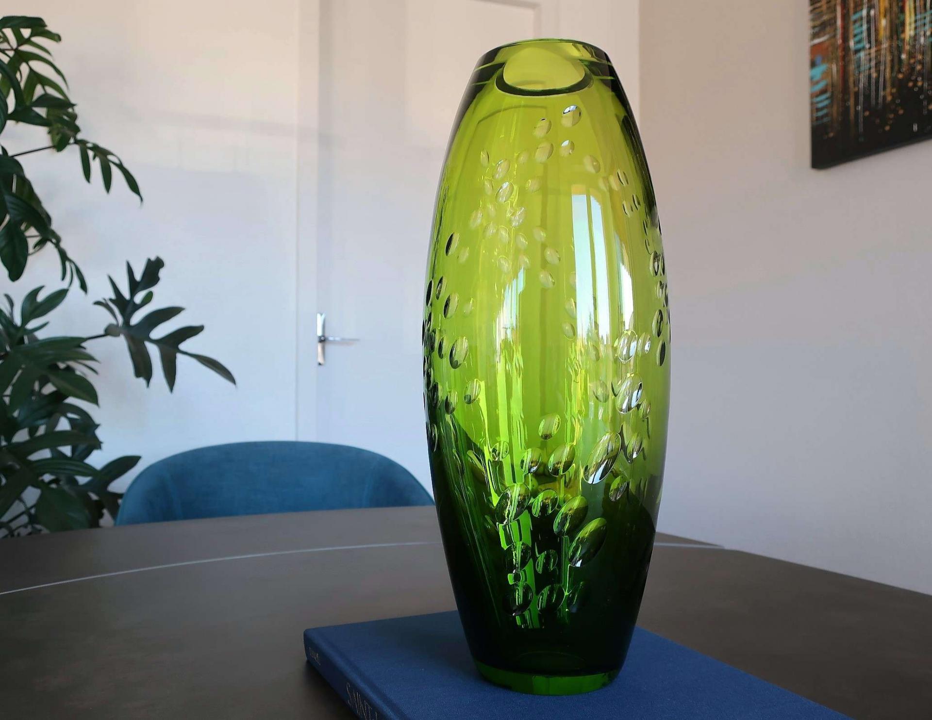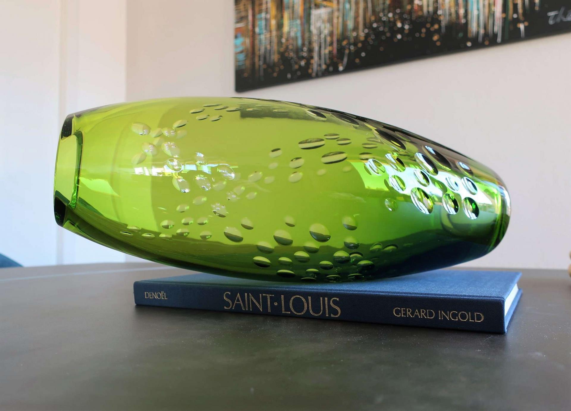 Une création néée de la collaboration entre le sculpteur, Designer, Serge Mansau et la cristallerie Saint Louis. Le nom Mansau n'est pas inconnu dans le monde du cristal car au-delà de ses créations pour les parfumeurs, on retrouve ses oeuvres éditées par la maison Baccarat ou encore Daum. Ce vase " Pluie " a vu le jour en 1992 pour disparaître à peine 3 années plus tard. Décliné en deux hauteurs et en cinq coloris différents dont le cristal clair, ce vase de forme oblongue, très moderne avec son décor de pastilles tourbillonnantes, devrait vous séduire et pourquoi pas...Vous faire danser sous la pluie !