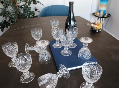Un service de verres en cristal Saint-Louis créé dans les années 1950, je cite, le modèle Versailles. Avec un nom aussi " royal ", il n'est pas sans rappeler la forme des verres du modèle Trianon. On retrouve un cristal taillé qui est omniprésent ( paraisons, jambe, bouton, pied ). Si de nos jours il n'est plus commercialisé, on le retrouve encore dans les catalogues anciens, jusqu'au début des années 1970. Peu présent sur le marché de l'occasion et le plus souvent, non identifié.
